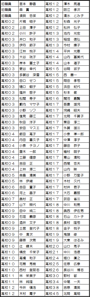 | 1 | 旧職員 | 宮田敬子 | 40 | 高校12 | 木村喬子 | |